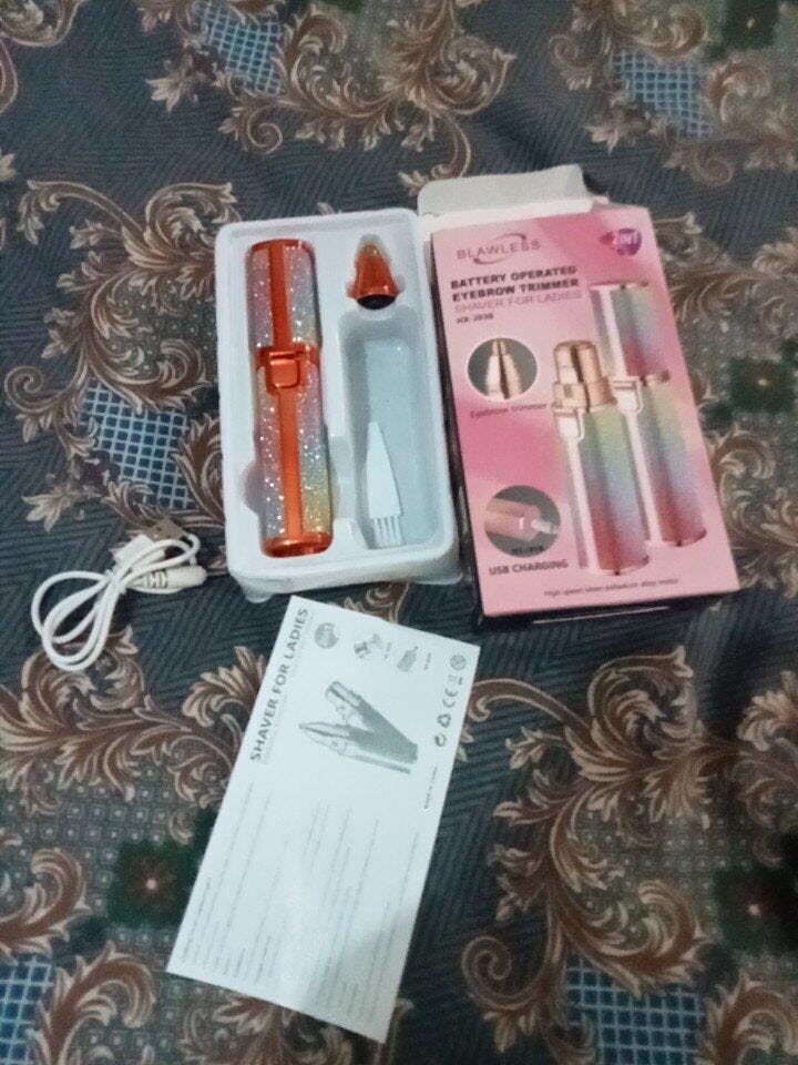 1x Main Grooming Unit (Glitter/Rose Gold Finish) + 1x Precision Eyebrow Trimmer Head (Pointed) + 1x Facial Shaver Head (Round/Flat) + 1x USB Charging Cable + 1x Cleaning Brush
